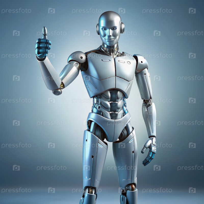 Серебряный робот поднимает большой палец перед голубым фоном
