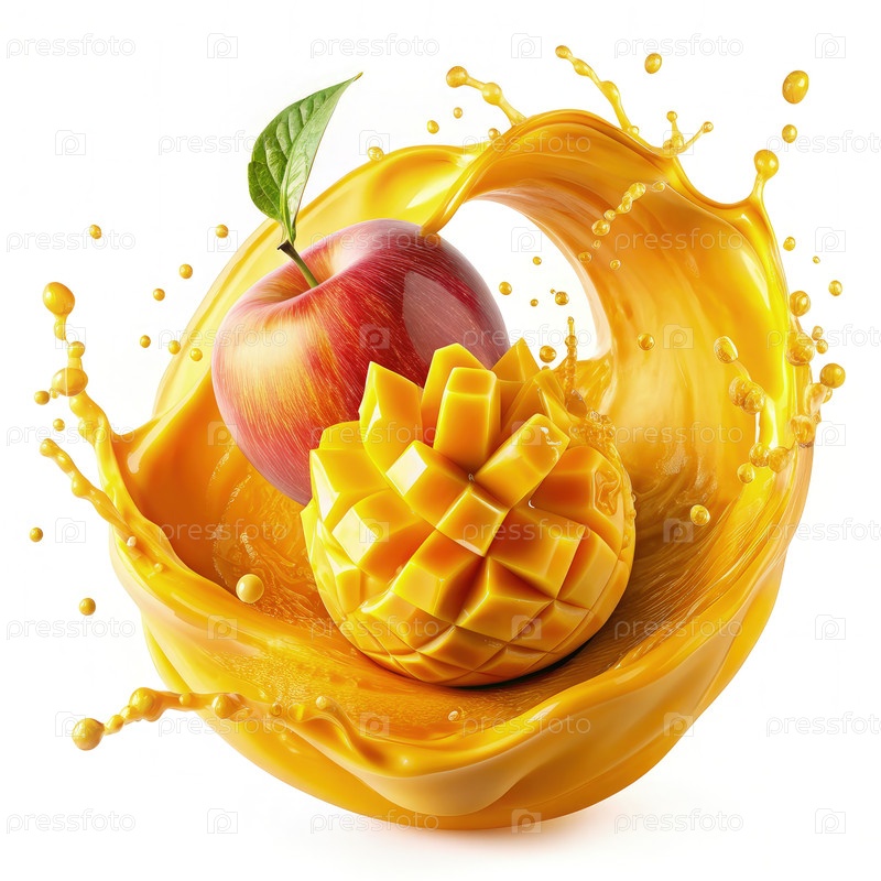 Сплэш манго и яблочного сока, изолированный на белом фоне