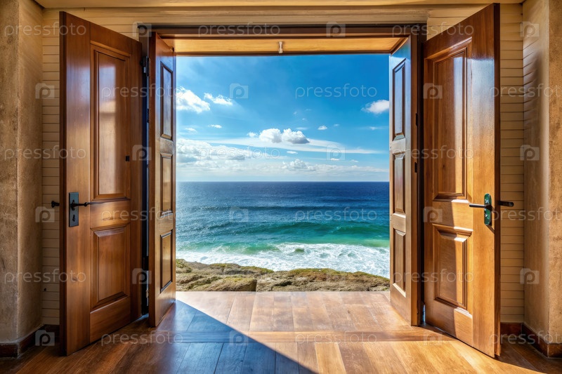 Открытые двери открывают потрясающий вид на океан с прибрежного дома