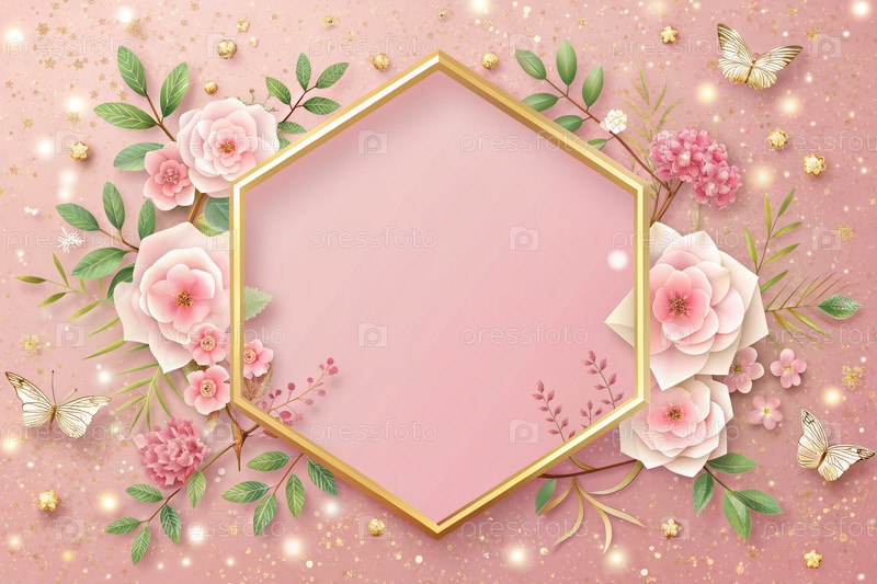 Розовая цветовая детская ванная приглашение с золотой шестиугольной рамой. генеративный AI
