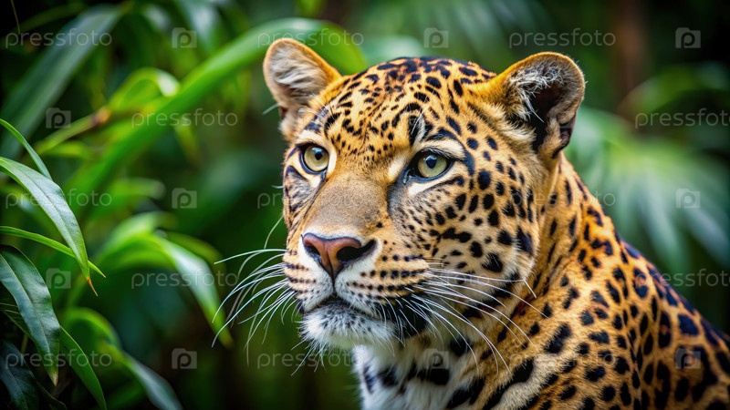 Ближайшее изображение головы леопарда в густой джунгли. генеративный ИИ