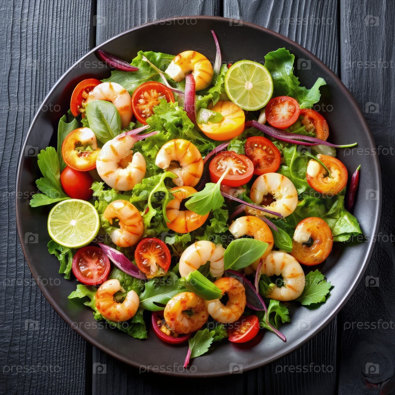 Главное изображение свежего креветочного салата с помидорами, лаймом и травами