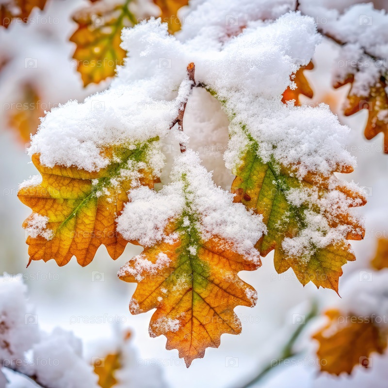 Осенние листья, покрытые свежим снегом в зимний день