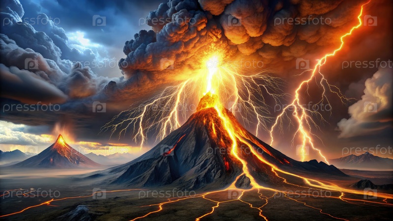 Драматическое извержение вулкана с ударами молнии во время штормового заката