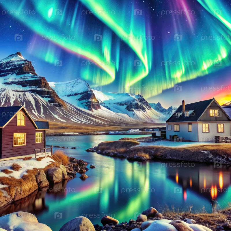 Исландская северная сияние дисплей над снежными горами и домами у озера
