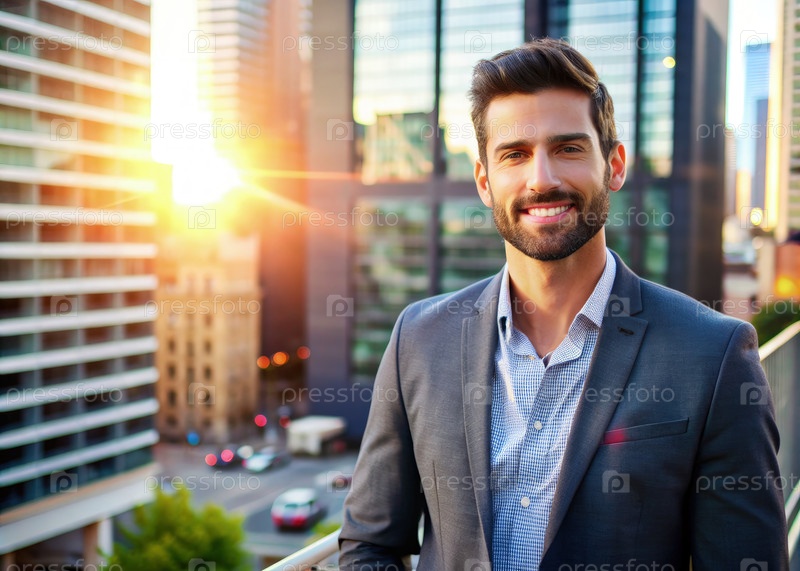 Улыбающийся бизнесмен в городском пейзаже с закатом