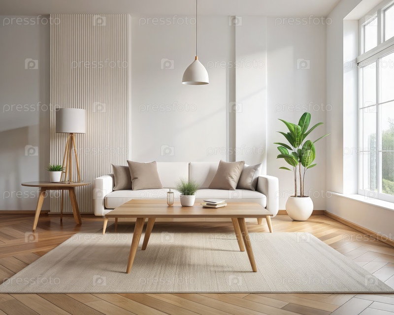 Минималистский интерьер гостиной с пустым кофейным столом и естественным светом