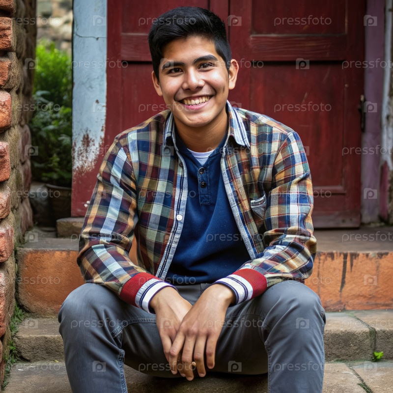 Улыбающийся перуанский молодой человек в платовой рубашке сидит на ступеньках