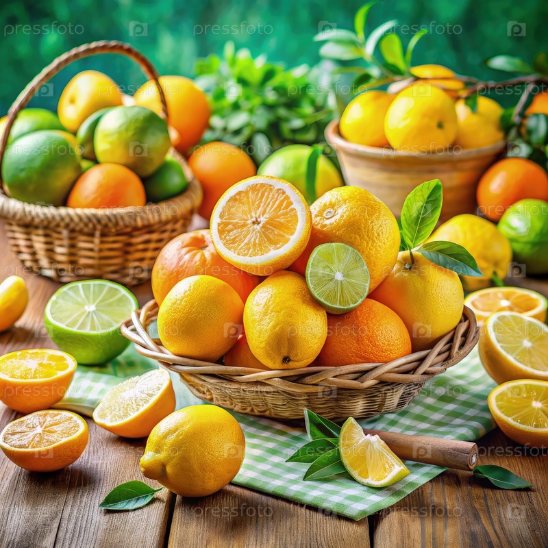Свежерезанные цитрусовые фрукты в деревянных корзинах из рустика