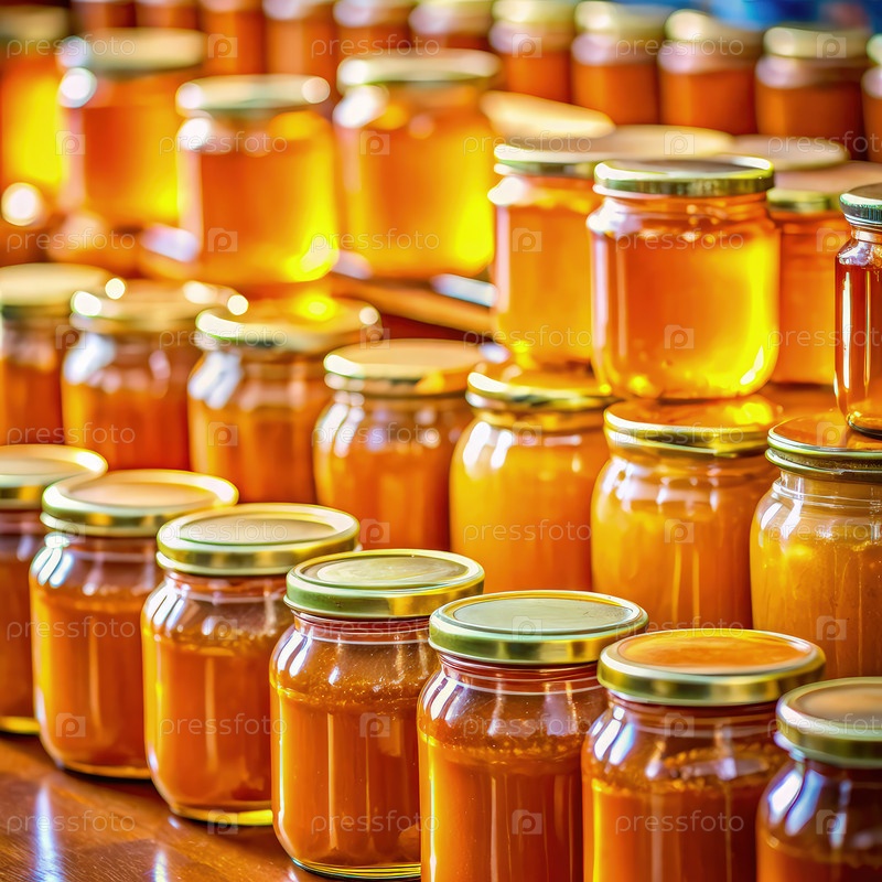 Горстки золотых банок с медом на деревянном столе на оптовом рынке