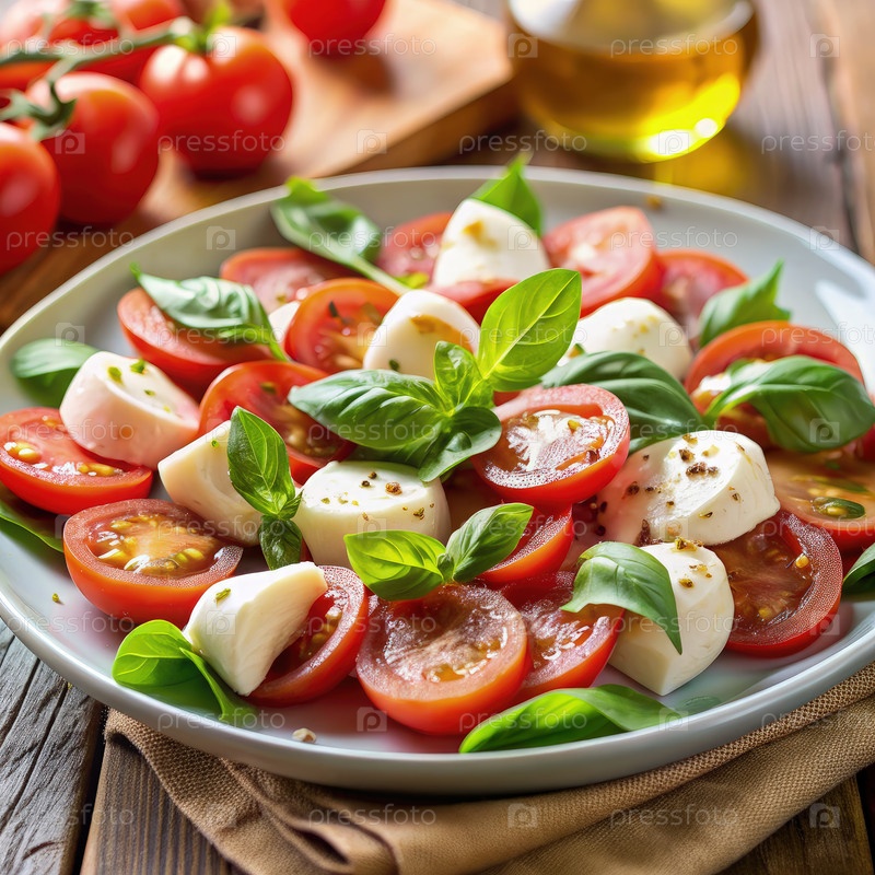 Свежий салат Капрезе с моцареллой, помидорами и базиликом на деревянном столе