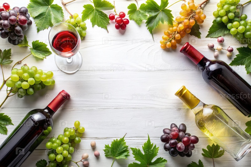 Плоская полоса красного вина, белого вина и винограда на белом деревянном столе