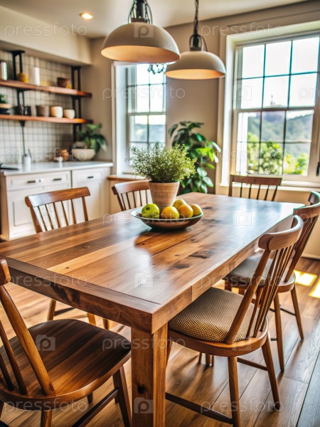Близкий взгляд на деревянный кухонный стол со стульями и миской с фруктами