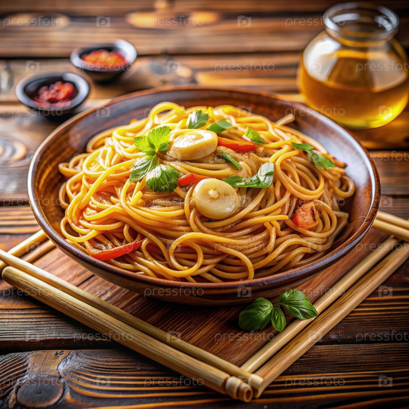Чаша жареной лапши с лимонным чаем на деревянном столе