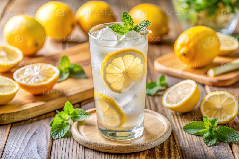 Освежающая ледяная лимонада с кусочками лимонов и мятой на деревянном столе