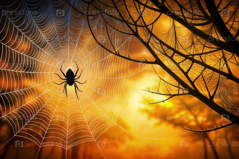 Большая паутина с черным пауком на закате