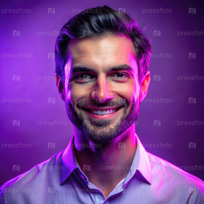 Портрет улыбающегося мужчины с фиолетовым освещением