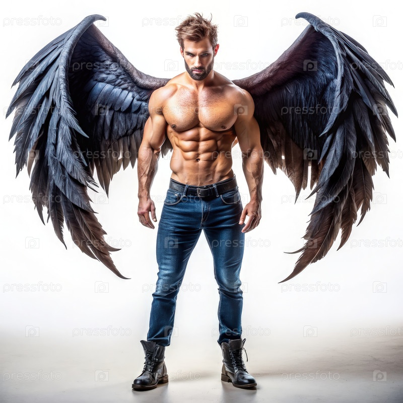 Мускульный мужчина с черными крыльями гаргуля, стоящий на белом фоне