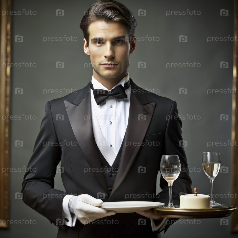 Формальный официант в смокинге, подающий тарелку и очки на подносе