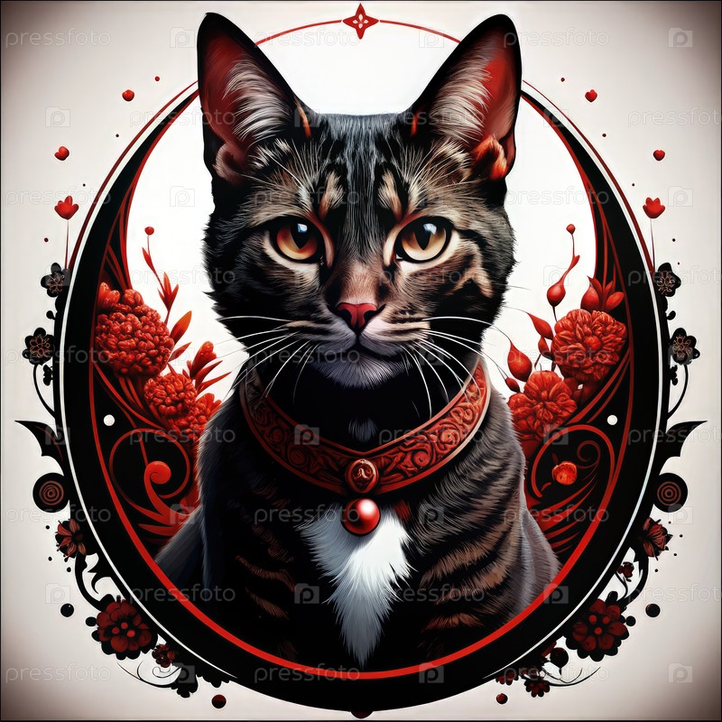 Черная кошка с красным воротником в орнаментированной круговой раме