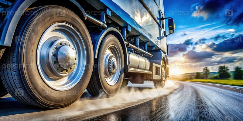 Ближайшее изображение колес полугрузовика на сельской трассе при закате солнца