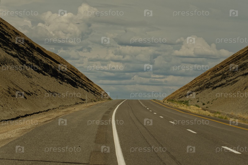 Открытая автомагистраль пересекает бесплодный каньон под облачным небом, вызывая чувства одиночества и приключений
