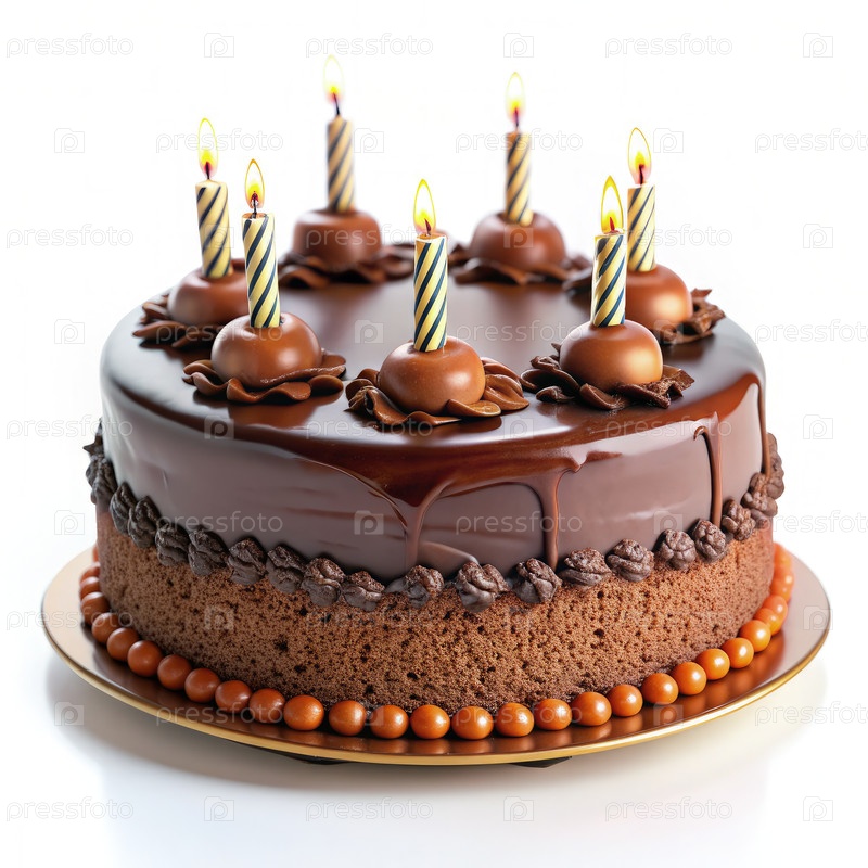 Шоколадный торт на день рождения с зажженными шоколадовыми свечами на белом фоне