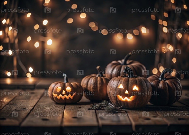 Джек-о'-Лантерны на деревенской столовой поверхности для Хэллоуина
