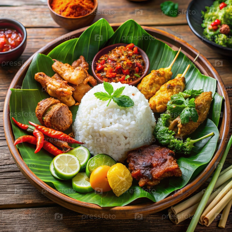 Индонезийская блюда с рисом, мясом и овощами на банановом листе