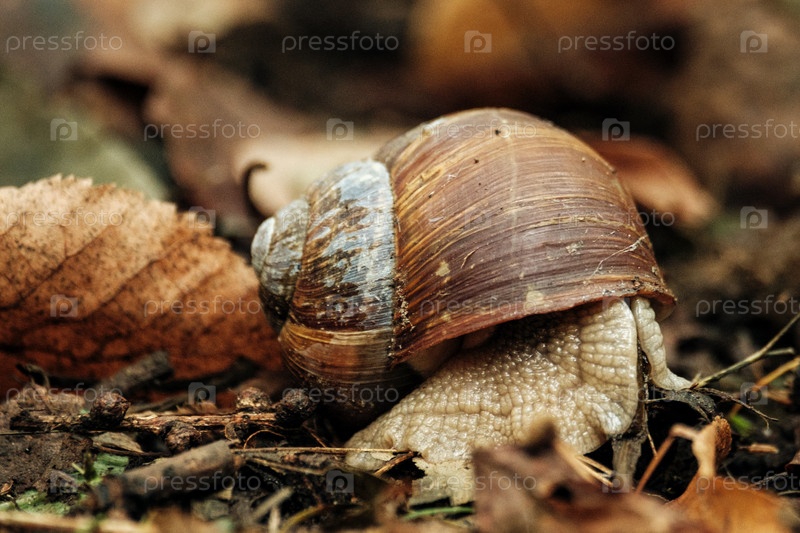 Интимный портрет коричневой улитки, ориентирующейся через разлагающуюся листву в спокойной лесной среде