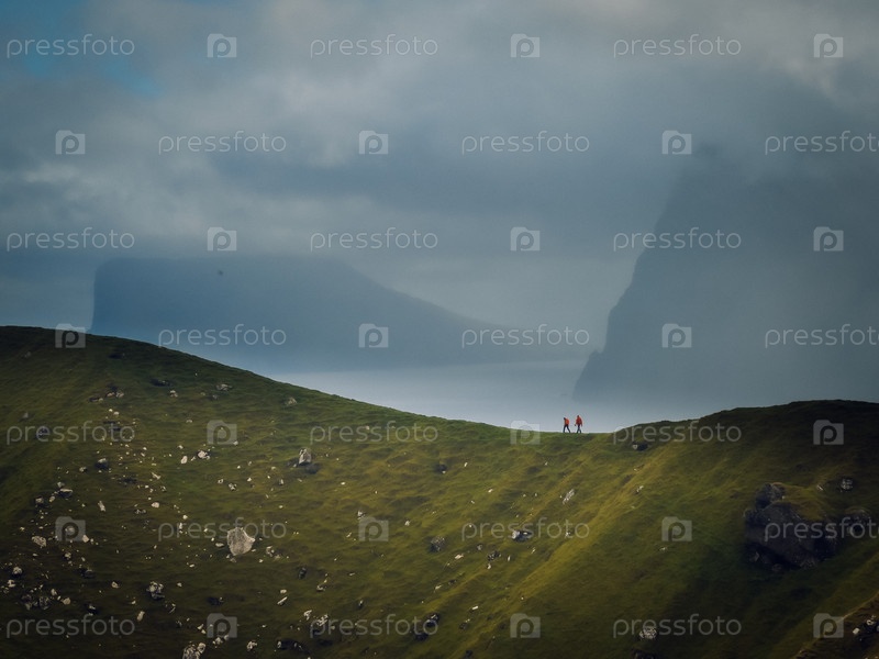 Одинокий авантюрист ходит в одиночку по возвышенной зеленой тропе с видом на океан и бурное небо