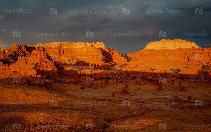 Впечатляющий пейзаж с многоуровневыми скалами и затененными каньонами во время совершенства Золотого часа