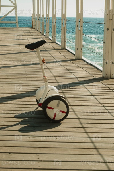 Мирная прибрежная обстановка с современным скутером, отдыхающим возле белых колонн и спокойной воды