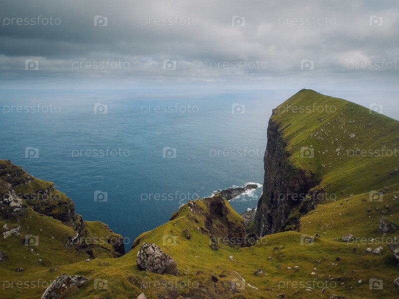 Впечатляющая прочная береговая линия показывает изолированные края скал под зловещими облаками и бурными водами