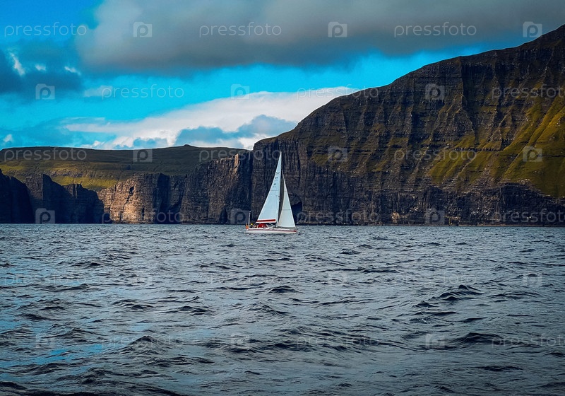 Яхта скользит мимо возвышающихся прибрежных скал. парусный корабль перемещается под облачным небом рядом с обрывами