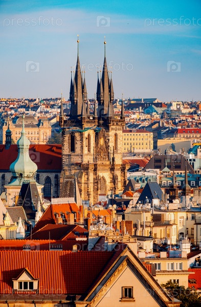 Элегантный городской пейзаж, демонстрирующий готические колокольчики собора и терракотовые крыши под чистым синим небом