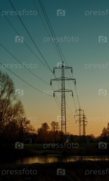 Тихий пейзаж с линиями электропередач и рекой.Сцена сумерка, в которой пилоны отражаются на спокойной реке