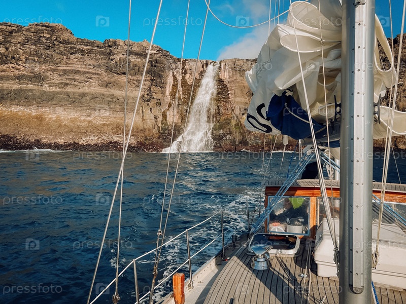 Яхта близка к водопаду. судно около Фарерского водопада среди диких скалистых береговых линий и океанического спрея