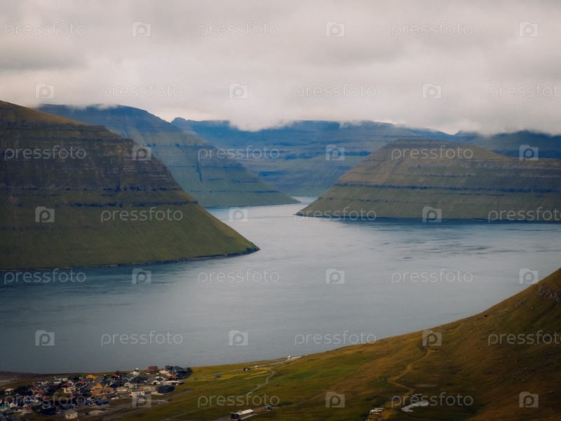 Живописное фьордовое поселение, окруженное слойными холмами и облачным небом