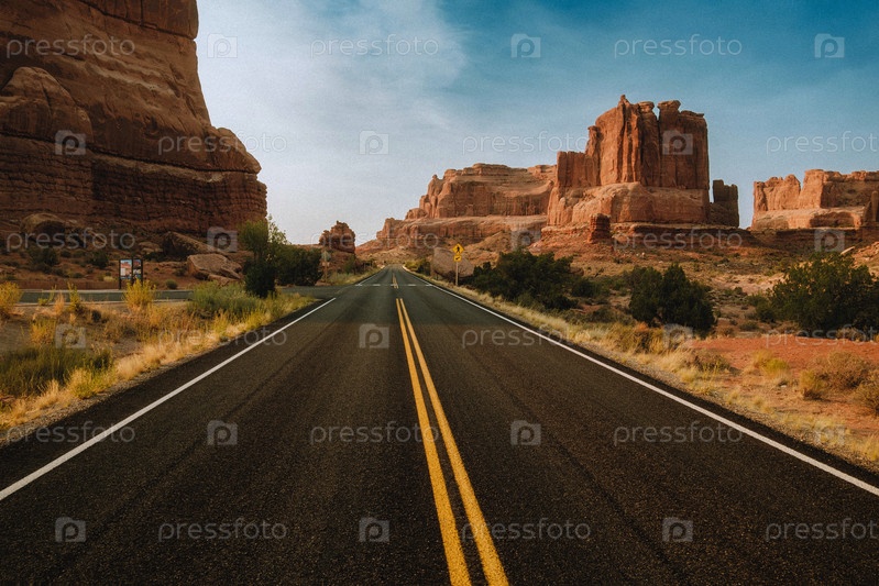 Путешествие через яркие красные скалы.Огромная автомагистраль проходит сквозь величественный каньон, пейзажи и открытые горизонты