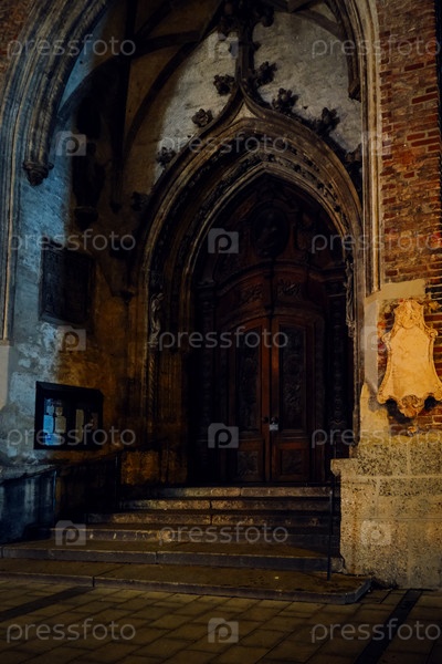 Исторический готический портал купается в теплом янтарном свете ночью