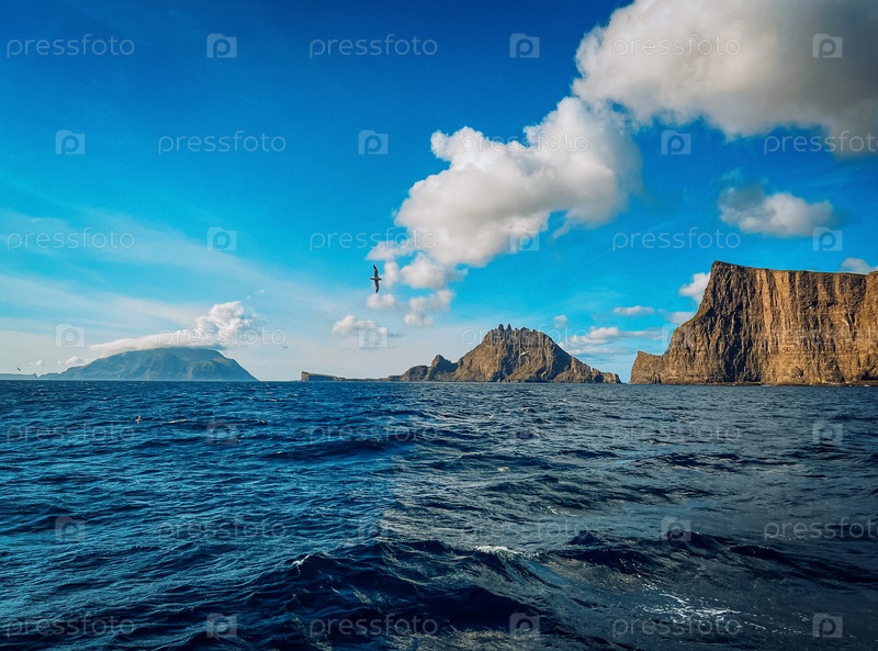 Удаленное скалистое побережье с возвышающимися базальтовыми образованиями и бурной погодой