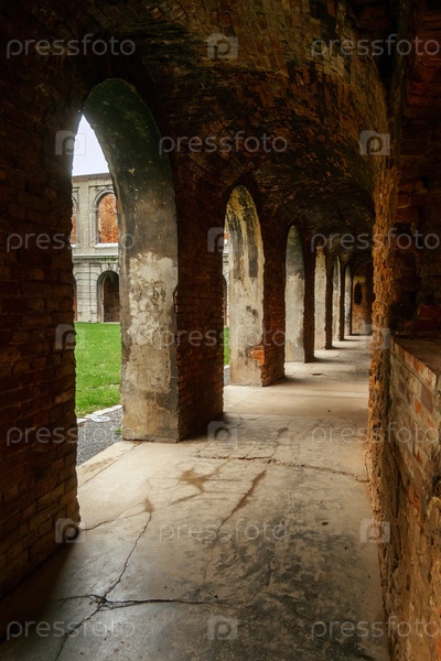 Древний монастырь с затененными арками. солнечный средневековый коридор в Польше с моховыми камнями