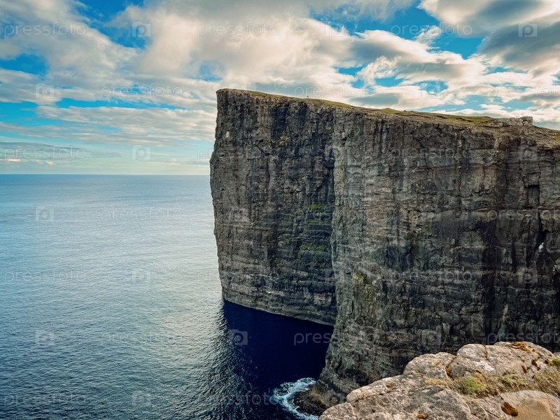 Исследование эрозии, раскрывающее прочные геологические слои против штормового неба и океана