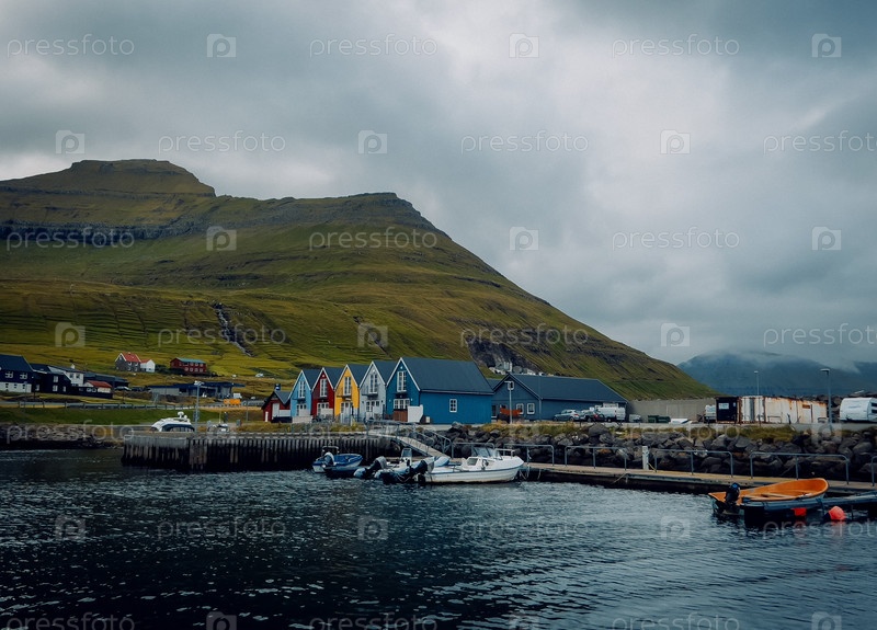 Спокойная североатлантическая прибрежная деревня с яркими домами и оживленными доками