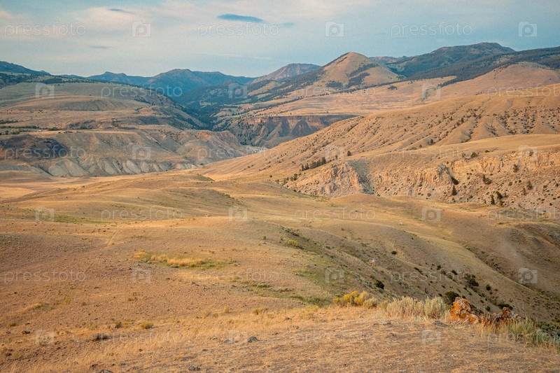 Спокойные холмы под утренним солнцем с горным горизонтом