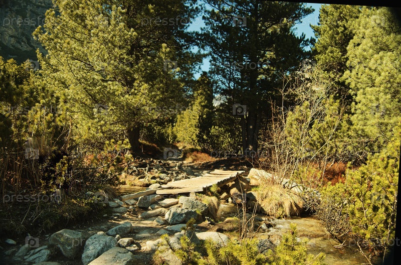 Спокойная вечерняя тропа через горные сосны.Сумерки в словацком лесу с скалистой почвой и сосновым навесом