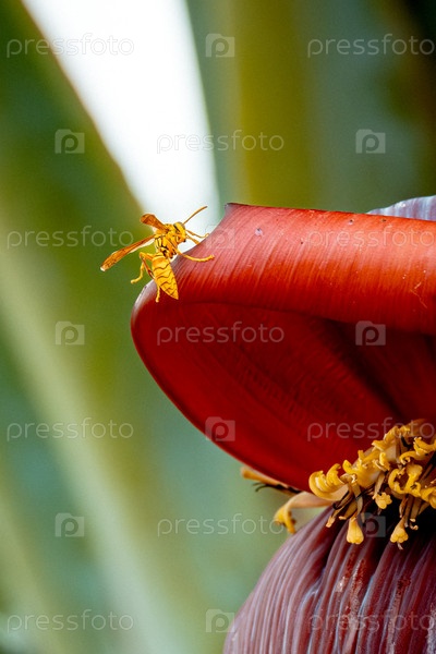 Подробное макросъемка бананового цвета.Живое изображение, захватывающее насекомое, питающееся цветочной пыльцей