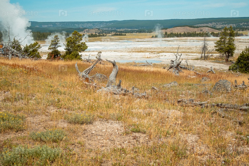 Огромный ландшафт с геотермальной активностью, безмятежная пустыня со растущим парами и устойчивой флорой