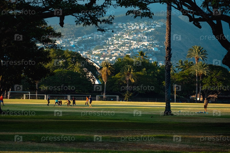 Любительские игроки согреваются под тропическим небом возле городского пейзажа